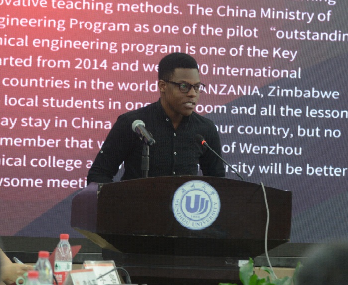 中外学生代表对校友的回归表示了热烈的欢迎。林芳同学说到“曾经你们以机电为豪;如今机电以你们为荣”GAYOS MWANGOSI said “After graduation,we may stay in China or go back to our country, but no matter where we are in the future,we will remember that we are a member of Wenzhou University.”